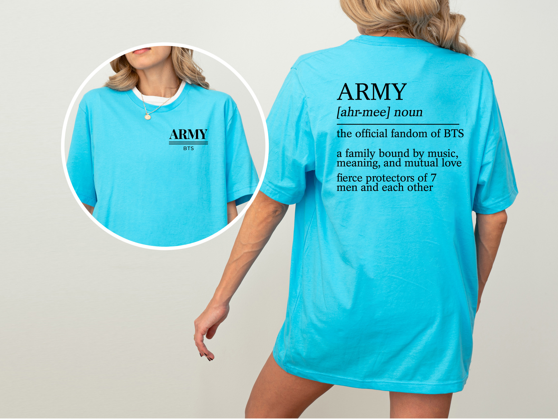 This T-shirt is made for ARMY—the official fandom name of BTS. ARMY stands for “Adorable Representative M.C. for Youth” and represents the millions of fans worldwide who support BTS with love, loyalty, and passion. Known for their strong bond with the members, ARMY has become one of the most powerful and positive fan communities in the world.